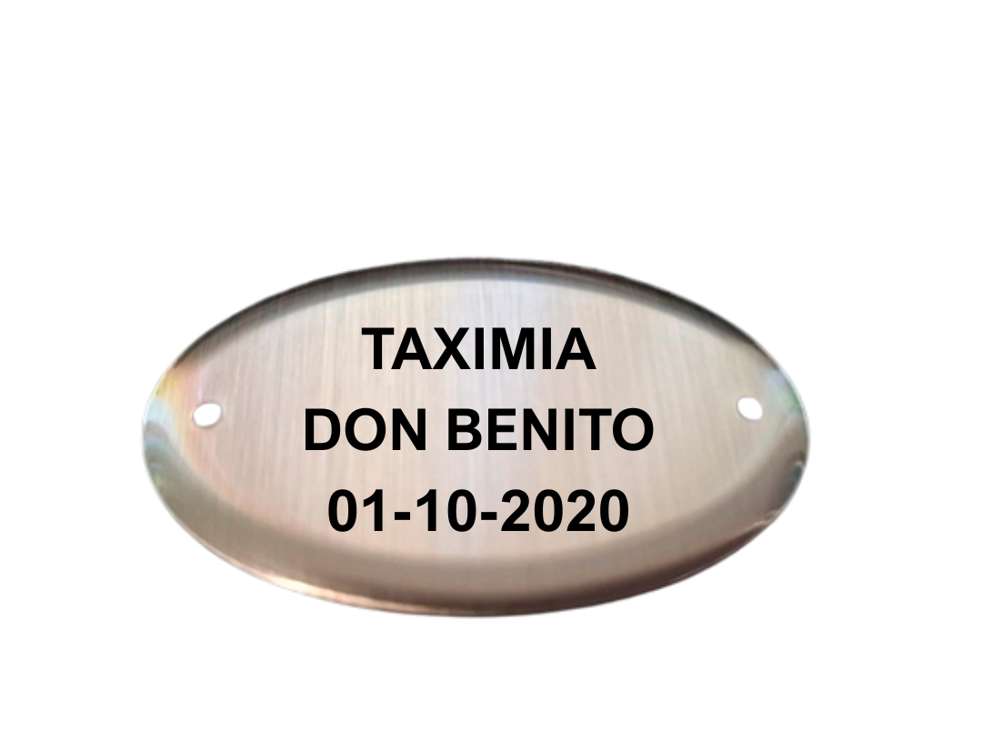 Chapa grabada plateada de 5 X 3 cm «incluye clavitos»